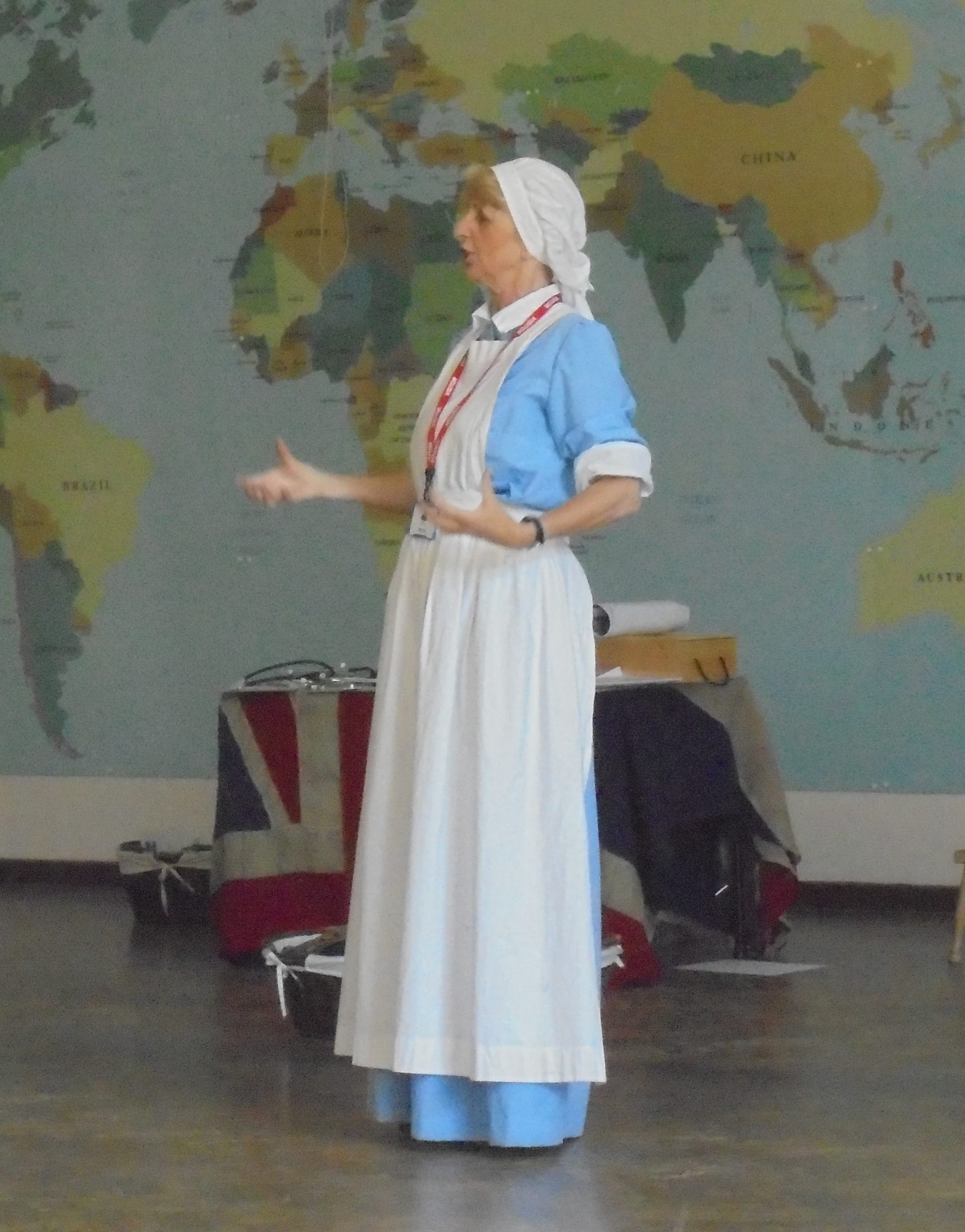 VAD Nurse Norton (Jenny Bland) introducing ‘My Village in WWI’ for the Bradfield Poppy Memorial Project, June 2016 at Stocksbridge Junior School